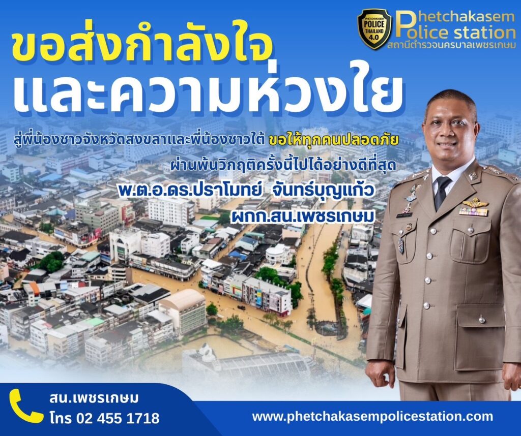 ขอส่งกำลังใจและความห่วงใย . สู่พี่น้องชาวจังหวัดสงขลาและพี่น้องชาวใต้ ขอให้ทุกคนปลอดภัย ผ่านพ้นวิกฤติครั้งนี้ไปได้อย่างดีที่สุด . พ.ต.อ.ดร.ปราโมทย์ จันทร์บุญแก้ว ผกก.สน.เพชรเกษม