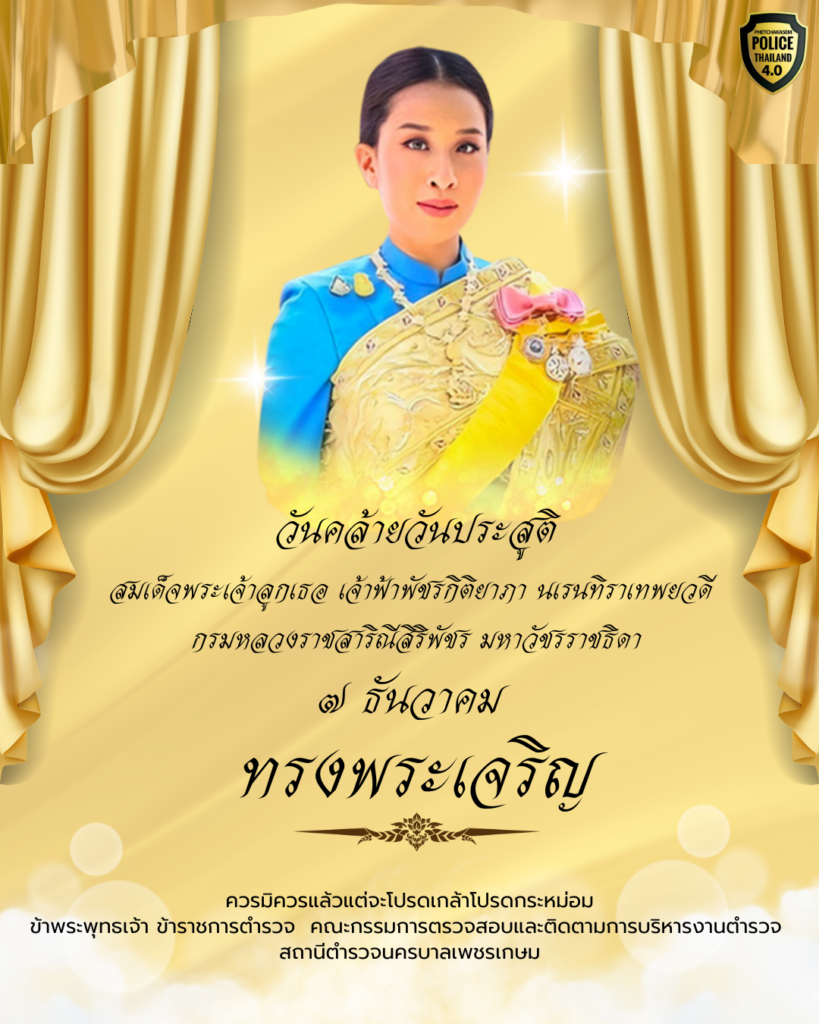 วันที่ 7 ธันวาคม วันคล้ายวันประสูติ สมเด็จพระเจ้าลูกเธอ เจ้าฟ้าพัชรกิติยาภา นเรนทิราเทพยวดี กรมหลวงราชสาริณีสิริพัชร มหาวัชรราชธิดา ขอพระองค์ทรงพระเจริญ✨ ควรมิควรแล้วแต่จะโปรดเกล้าโปรดกระหม่อม ข้าพระพุทธเจ้า ข้าราชการตำรวจ คณะกรรมการตรวจสอบและติดตามการบริหารงานตำรวจ สถานีตำรวจนครบาลเพชรเกษม